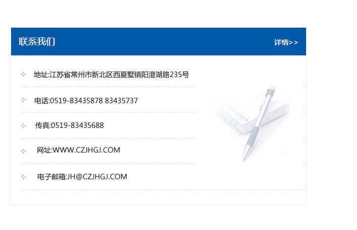 傳真:0519-83435688    郵編:213135    網址:WWW.czjhgj_com.86153631.com    電子郵箱:JH@czjhgj_com.86153631.com